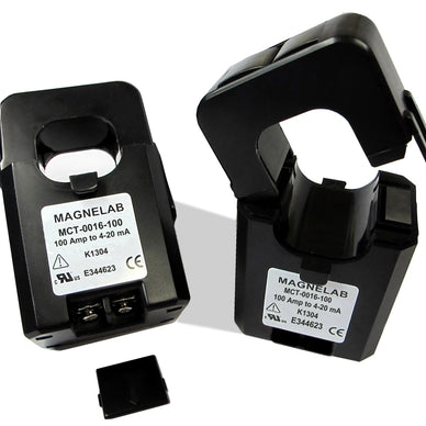 Magnelab's MCT-0016 Split-Core AC Current Transducer (previously MAG-J16M420) is a 16mm split-core current sensor that transforms an AC current input 10 to 100 Amps to a 4-20 mAdc output. Split-core transducers are ideal for installation on existing electrical wiring by snapping around the conductor. The MCT-0016 has a self-locking mechanism.