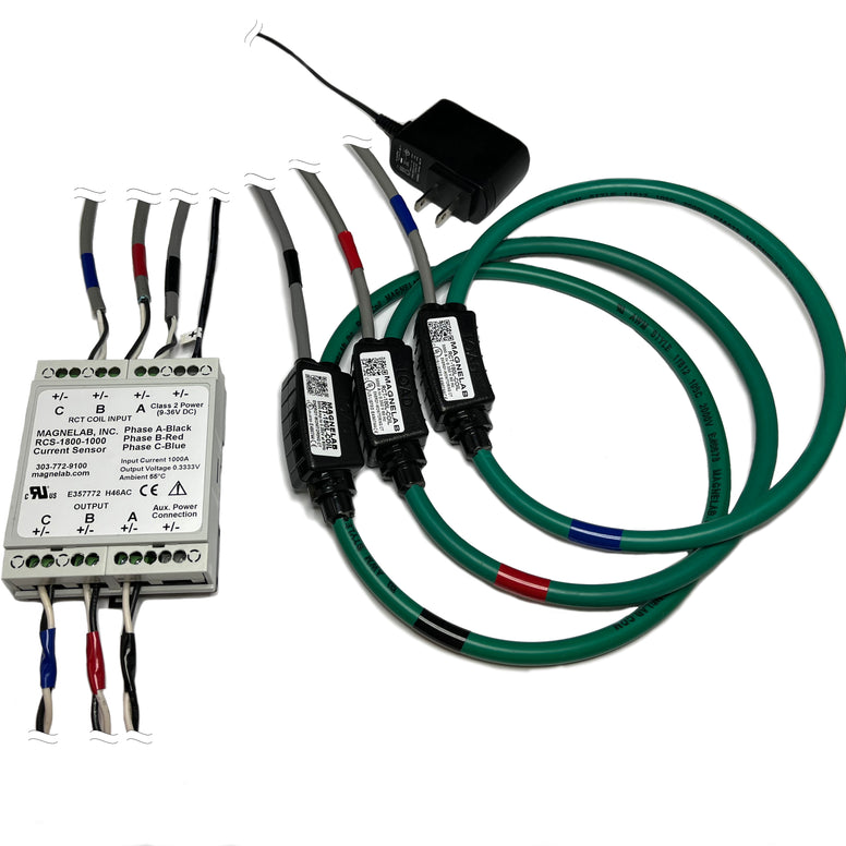 The RCS-1800 three phase Rogowski Coil converts AC input current of up to 5000 amperes to an AC output of 0.333 volt. In order for it to operate properly, it will need a DC power supply that has to operate between 9 and 36 Vdc. The RCS-1800 current sensor comes in two models, one with screw terminals and one coming with an integrator that has flexible strain relief cables attached to it. With the RCS-1800, you will get an 18 inch rope CT that has multiple options for the amp rating. When you purchase it, therefore, you do have to indicate which amp rating you will require. Do also note that you will need a power supply for the integrator, which must be between 9 and 36 volts.